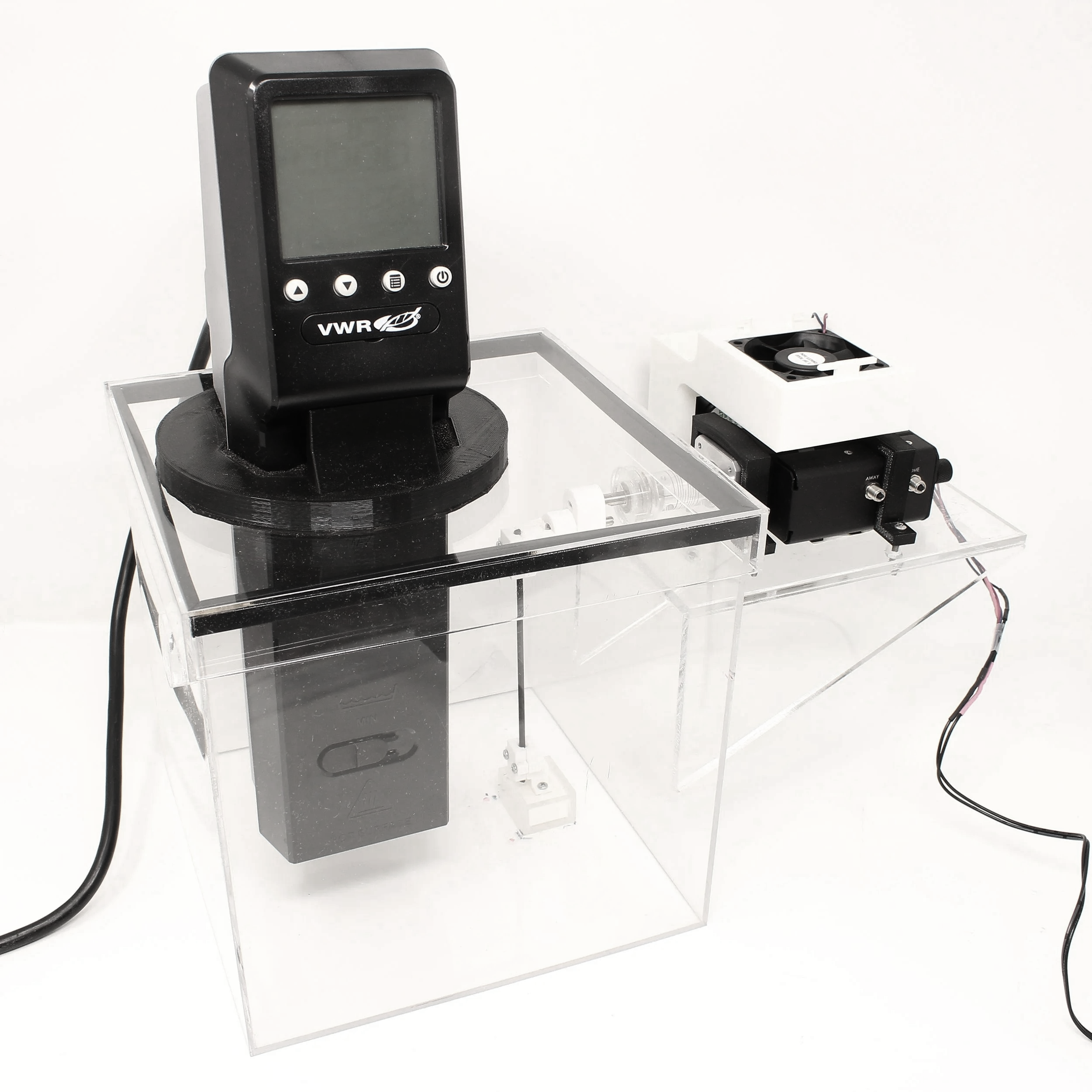 Enclosure — Custom acrylic test chamber for fluid containment and visibility.